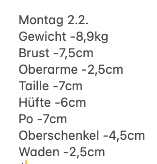 Außerdem kann ich dir auch gerne eine Liste mit empfohlenen und verbotenen Lebensmitteln schicken und eine Seite auf der du deine Fortschritte notieren kannst. Jede Woche solltest du dich nämlich auch wiegen und messen. Diese Messwerte haben mich am Anfang komplett geflasht.